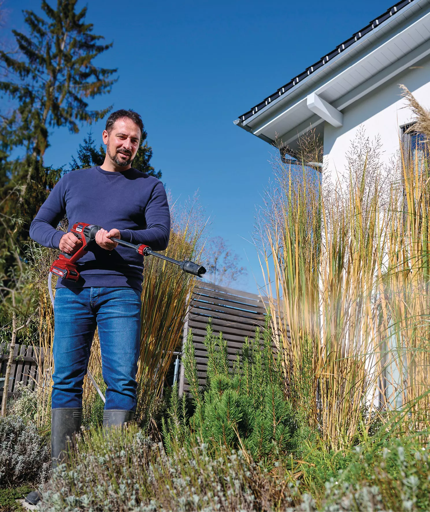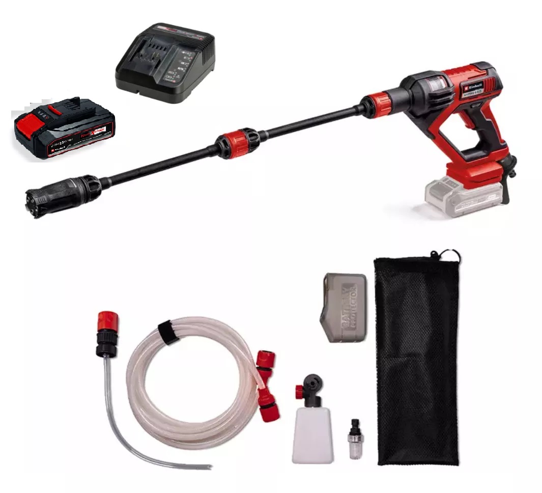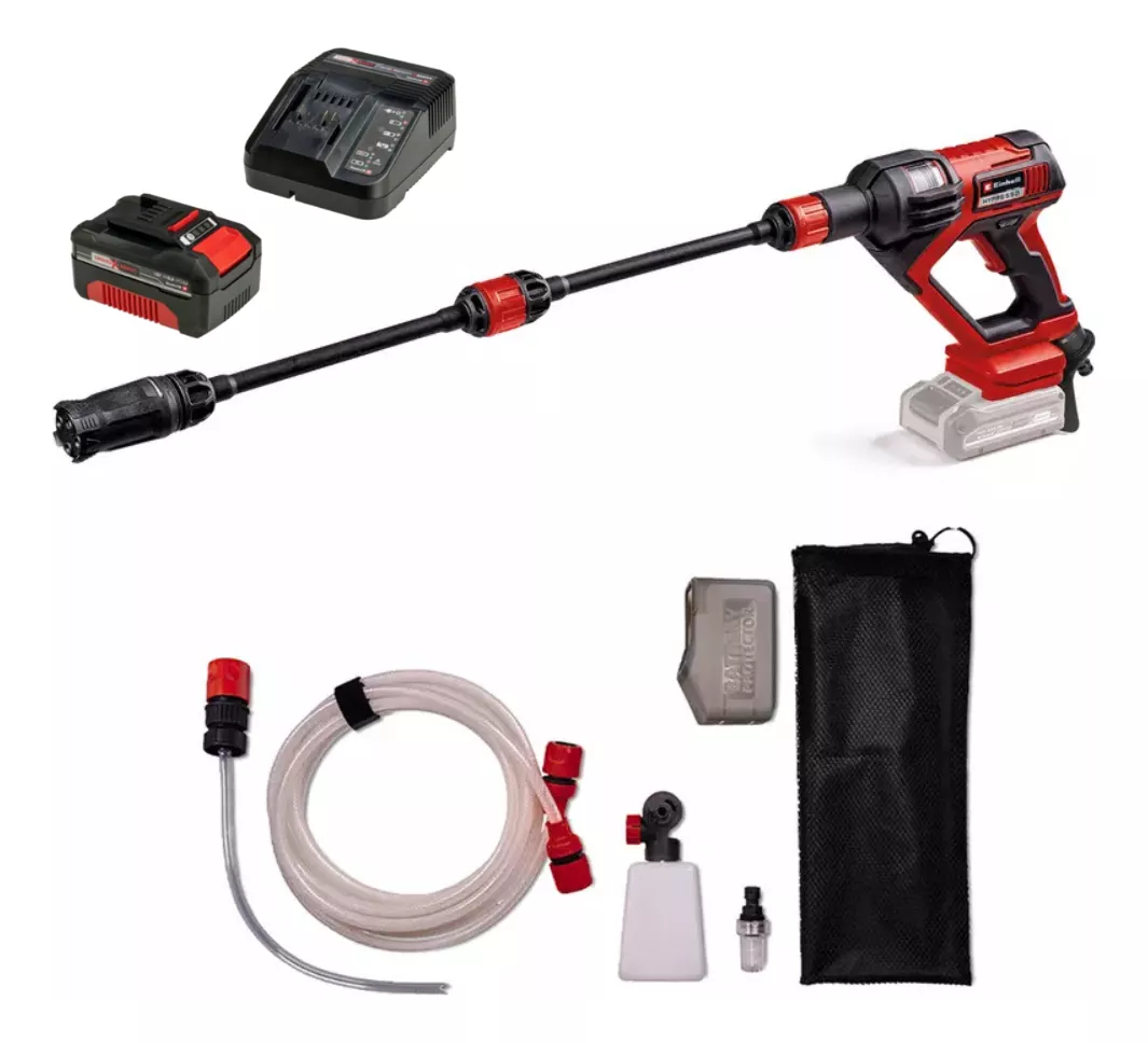 La pistola limpiadora a presión con batería HYPRESSO 18/24-1 de Einhell permite una flexibilidad sin cables en la limpieza y el riego alrededor del jardín y la terraza. La pistola limpiadora a presión con batería es miembro de la familia Power X-Change en la que pueden combinarse entre sí flexiblemente las baterías, cargadores y equipos de sistema. La limpiadora de presión media con batería funciona con una máx. presión de 24 bar y un caudal de máx. 240 litros de agua por hora. Gracias al modo Eco se puede prolongar la duración de la batería del limpiador a presión al pulsar un botón. La pistola pulverizadora está equipada con una boquilla ajustable en 4 posiciones. Cuenta con un chorro puntual y ancho, así como un chorro de pulverización para riego y un chorro giratorio para limpiar la suciedad persistente. La pistola de limpieza de presión media no solo se puede conectar a la manguera de jardín gracias a la conexión de manguera, sino que también puede aspirar agua de cubos, bidones o un estanque gracias a la manguera de aspiración de 5 metros con filtro de agua. Para utilizar agua de botellas de PET estándar en el camino, se suministra un adaptador para botellas. En el alcance del envío se incluyen dos lanzas de extensión, una botella de pulverización de espuma que es ideal para el lavado de automóviles y una bolsa de malla para guardar los accesorios. Además, se incluye una protección contra salpicaduras de agua, que simplemente se estira para una protección adicional de la batería Power X-Change contra la humedad sobre esta.
